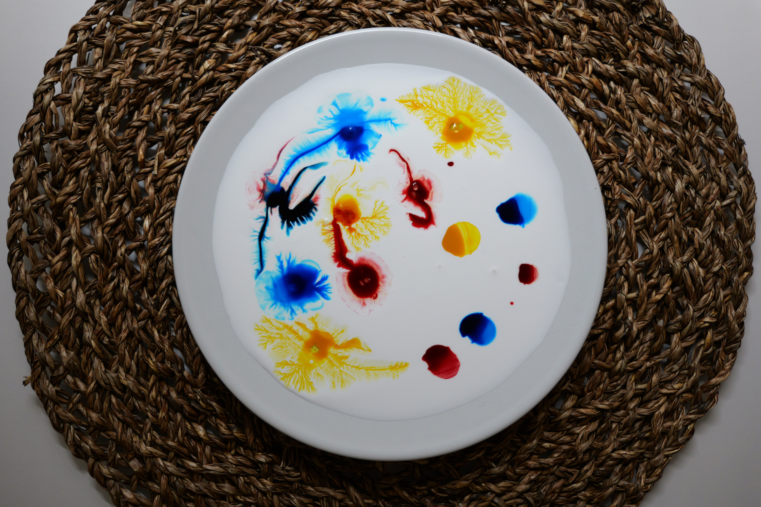 Antonio describe la imagen como “Un tensioactivo sobre unas gotas de agua con colorante hace que estas se expandan sobre la cola blanca, debido al gradiente de tensión superficial (efecto Marangoni). En el proceso, se crean unas ramificaciones similares a las que ocurren en la inestabilidad de Saffman–Taylor, que se da cuando un fluido desplaza a otro con mayor viscosidad. Esto no ocurre sobre aquellas gotas sin tensioactivo.”