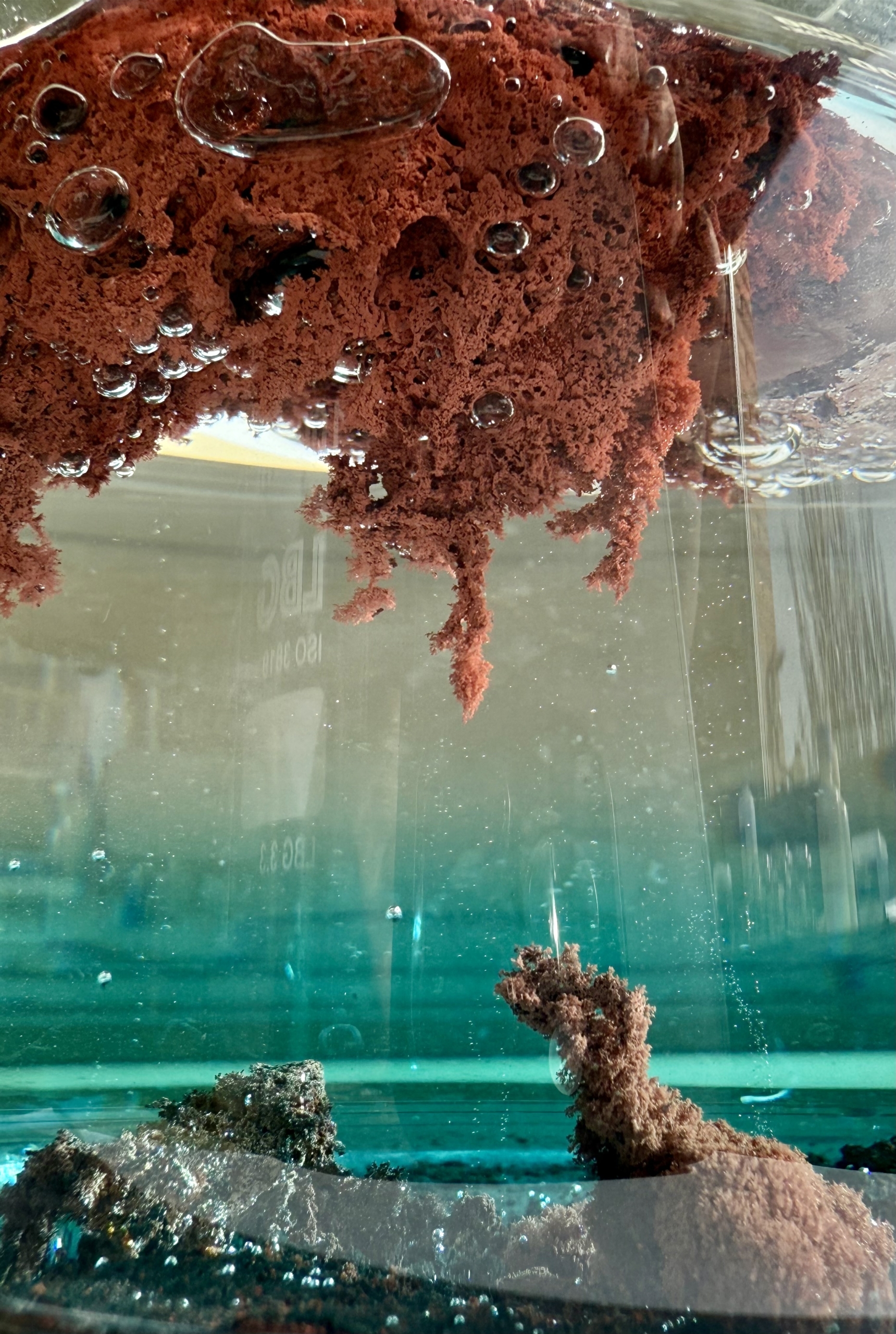Celia describe la imagen como “El aluminio metálico en presencia de Cu2SO4 reacciona para formar cobre metálico y Al2(SO4)3. En la imagen pueden observarse todos los componentes de la reacción, cobre rojizo en la parte superior, aluminio metálico en la parte inferior y, en medio acuso, el CuSO4 de color azul y el Al2(SO4)3 en la parte superior, incoloro. De forma simultánea, burbujas de H2 suben y quedan atrapadas por el cobre”