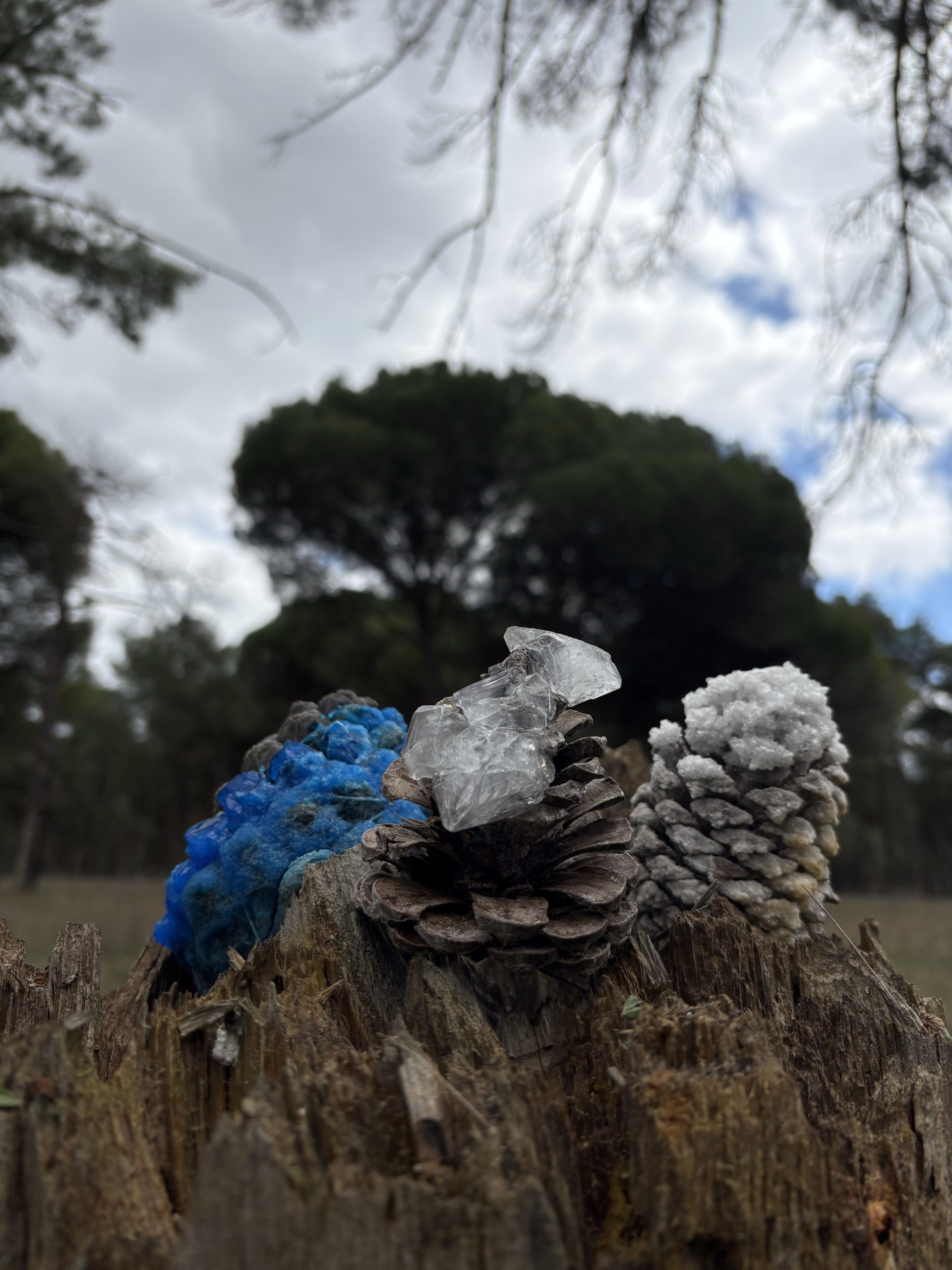 Elena describe la imagen como “Pedrajas de San Esteban es una localidad conocida por su gran tradición piñonera. Desde nuestro laboratorio, hemos querido tener presente nuestra historia a la vez que desarrollábamos nuestro trabajo experimental. En la imagen, se muestran tres piñas que han sido sometidas a un proceso de cristalización en el cual los iones se han enlazado hasta formar una red cristalina”