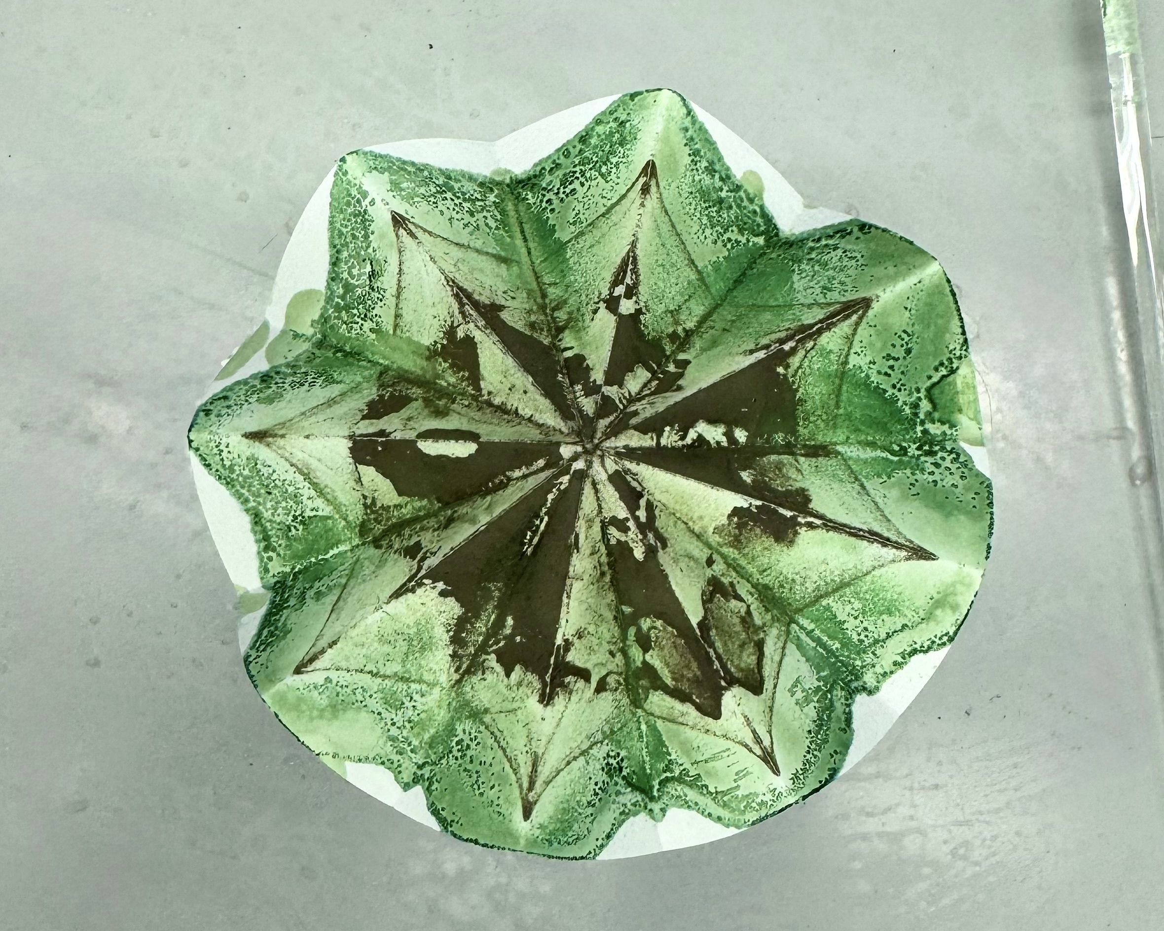 Alex describe la imagen como “Durante la síntesis de acetilacetonato de vanadilo a partir de V₂O₅, el papel de filtro revela visualmente el proceso químico: en el centro queda el óxido sin reaccionar y en la periferia, el característico color verde del complejo formado. El patrón radial refleja la migración del producto, dando lugar a una imagen que combina química, color y forma en una instantánea única del laboratorio.”