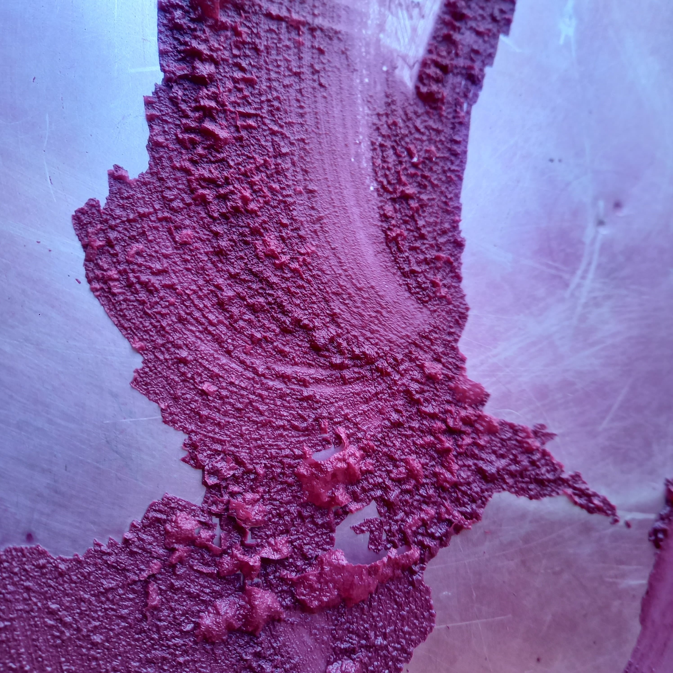 Fernando describe la imagen como “El violeta de metilo es un compuesto químico, una rosanilina, que en disoluciones ácidas, neutras y básicas exhibe colores que van del violeta al azul. Sin embargo, a pH muy ácido, su estructura molecular cambia y adquiere un tono verdoso. Los distintos valores de pH de esta mezcla crean el escenario ideal para una ascensión cromática de nuestra enigmática figura.”